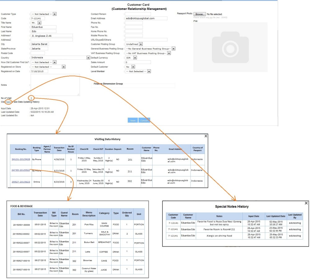 - CRM for returning guests with key information like food, service and dollar amount spent on previous stays